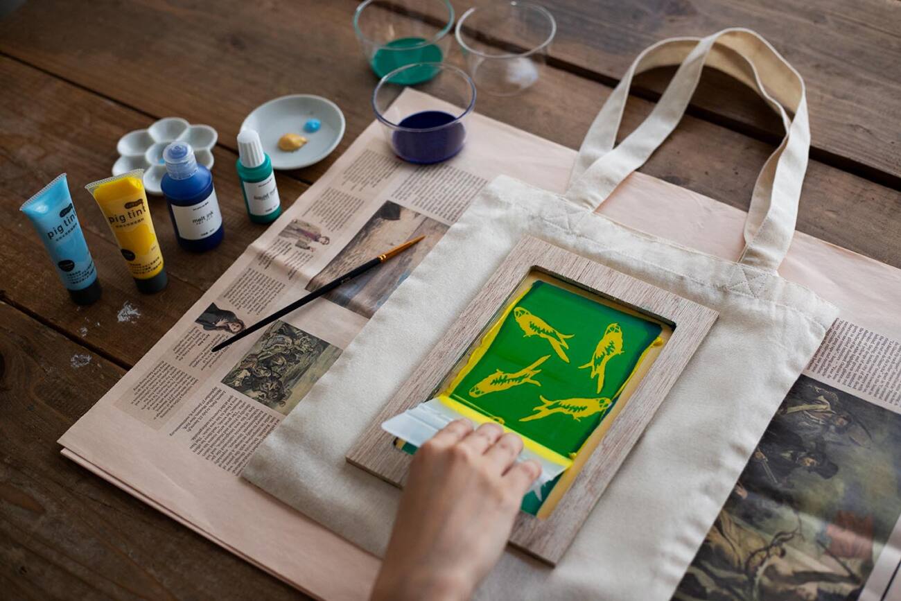 ・シルクスクリーンのインクとしても使用でき、「ティントプリントセット」を使って版を作れば、Tシャツやバッグなどのオリジナルグッズを制作することが可能