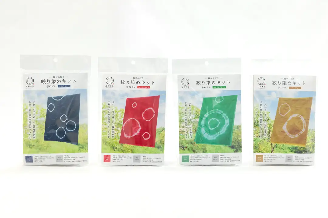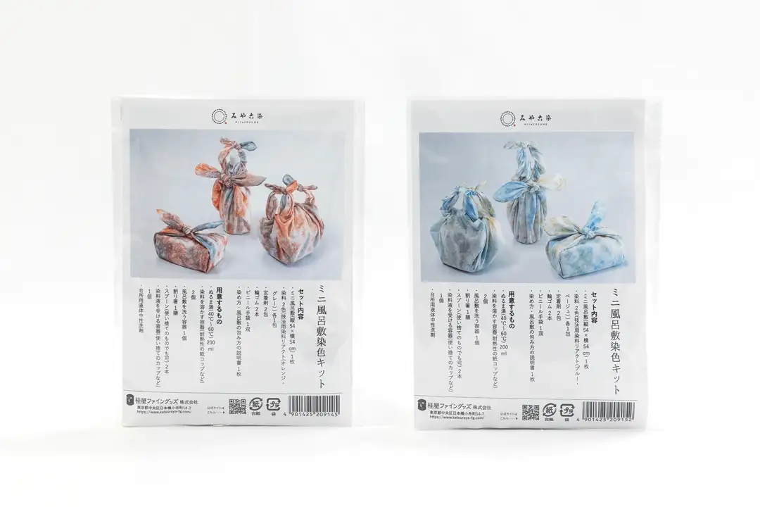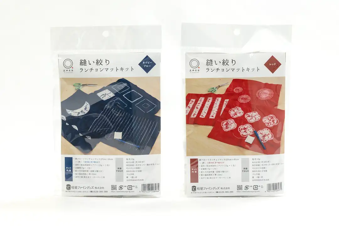 ・折り畳んだ布を2枚の板で挟み、2色の染料に浸すことで規則的な模様が現れる伝統的な染色技法を体験できるキット
