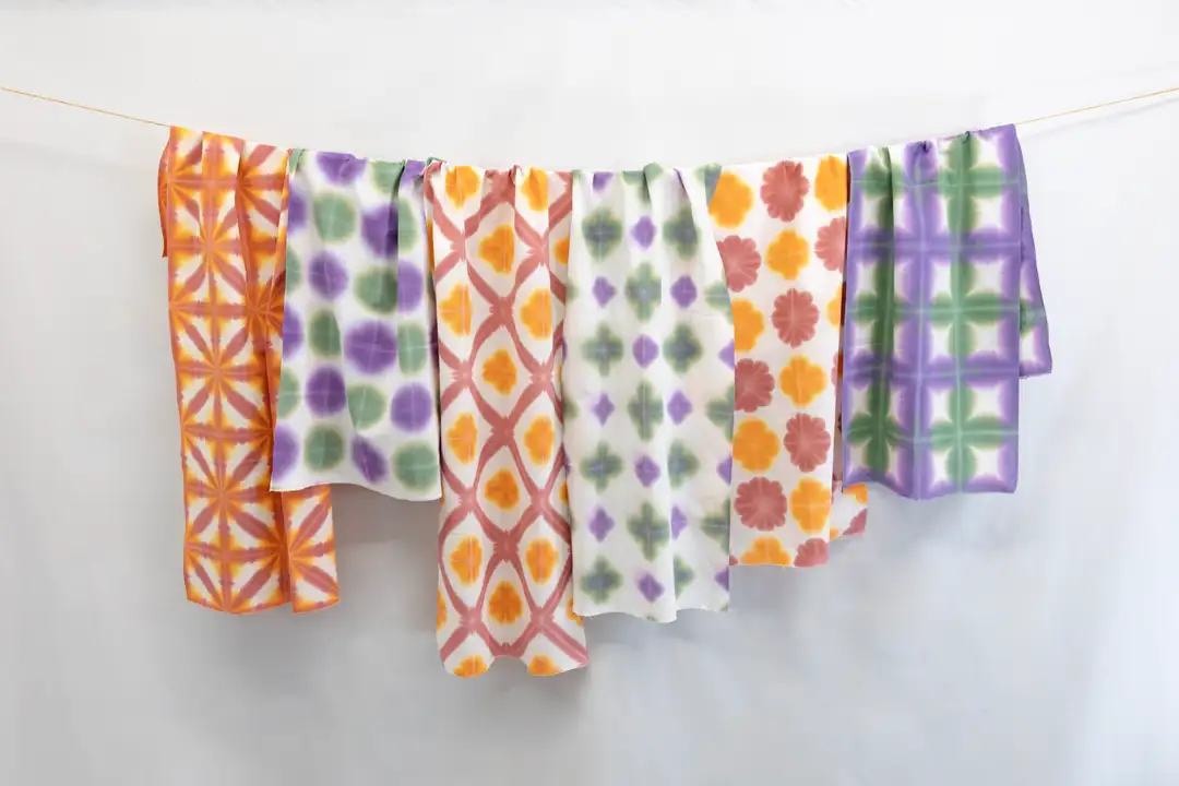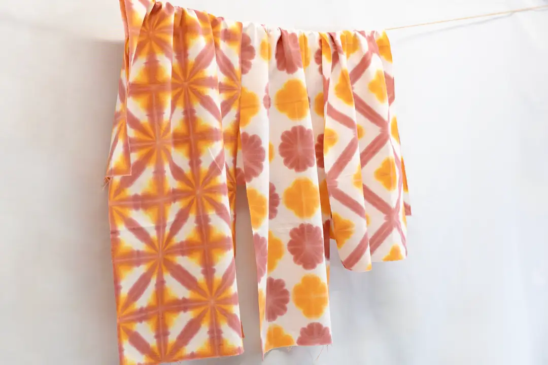 ・折り畳んだ布を2枚の板で挟み、2色の染料に浸すことで規則的な模様が現れる伝統的な染色技法を体験できるキット