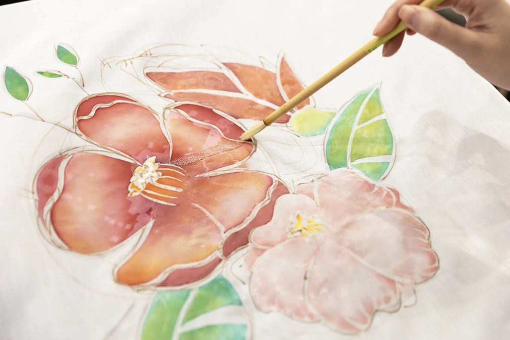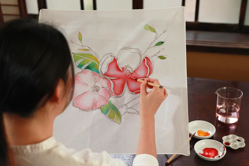 ろうという素材の特性を活かし、ヒビや重なりで模様を表現できる染色技法です。