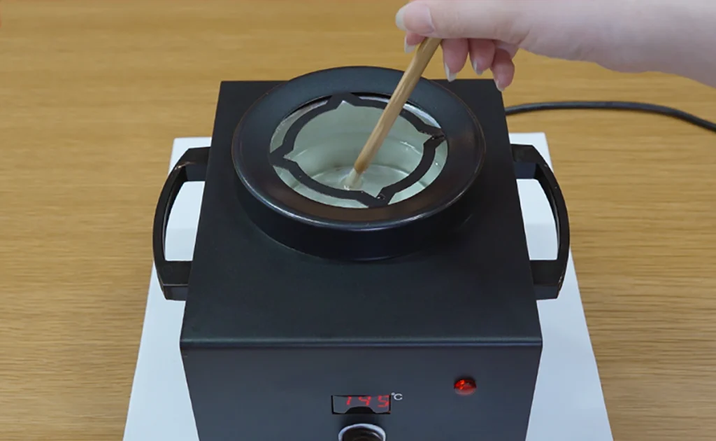 ろう溶器のろうカップに布用ろうを入れてスイッチを入れます。