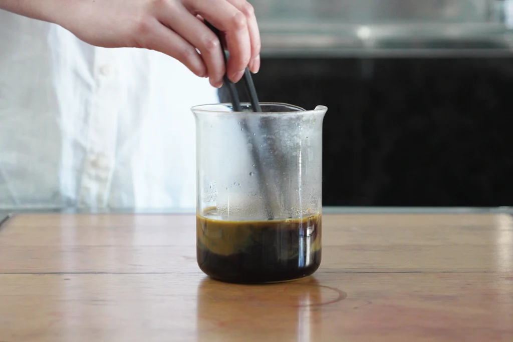 堅牢スレン建染め染料の染料とスレン安定補助液を混ぜ、そこに熱湯を加えます。