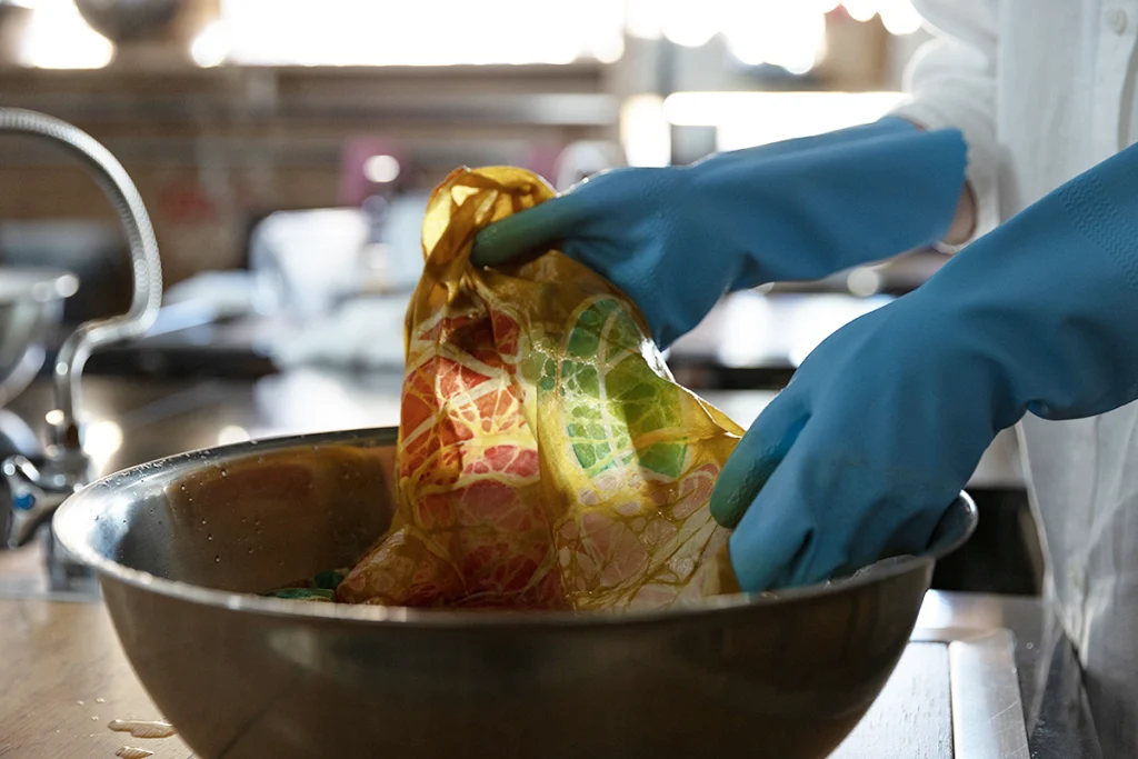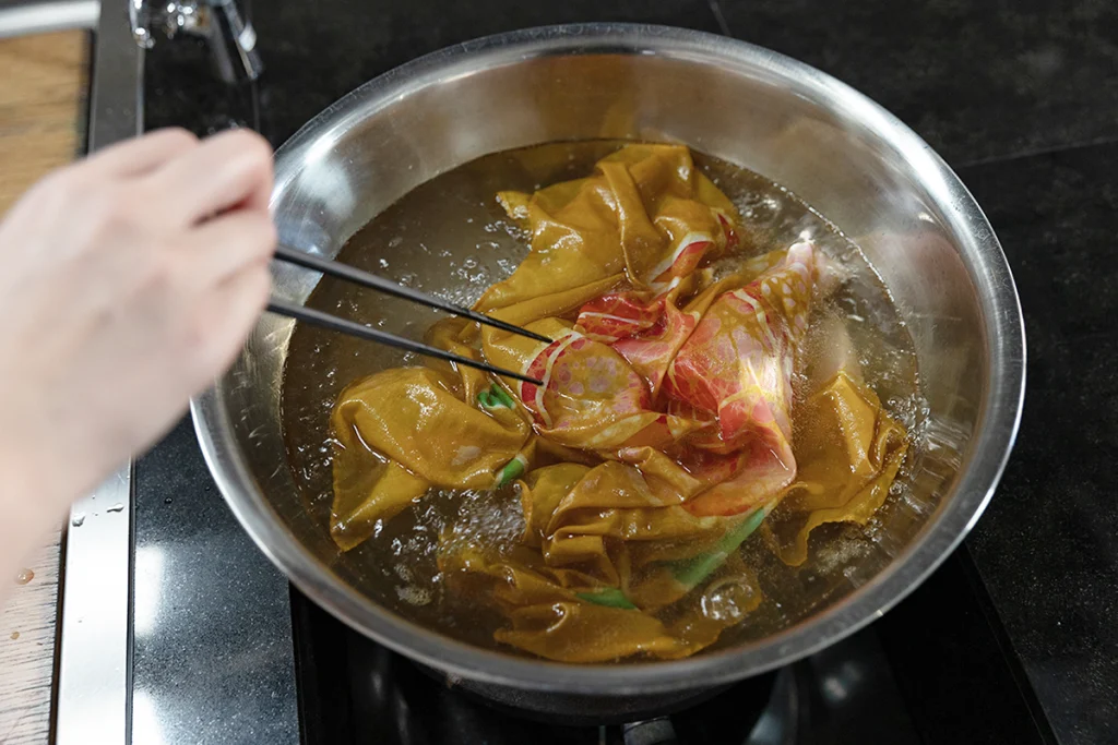 ろうが割れすぎないように注意しながら、⑥で浸しておいた布の水気を軽く切り、広げてから染め液に入れ、静かにかき混ぜながら20 分間染めます。