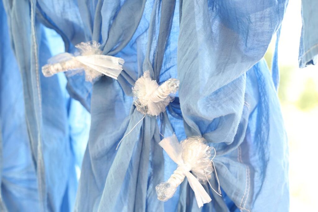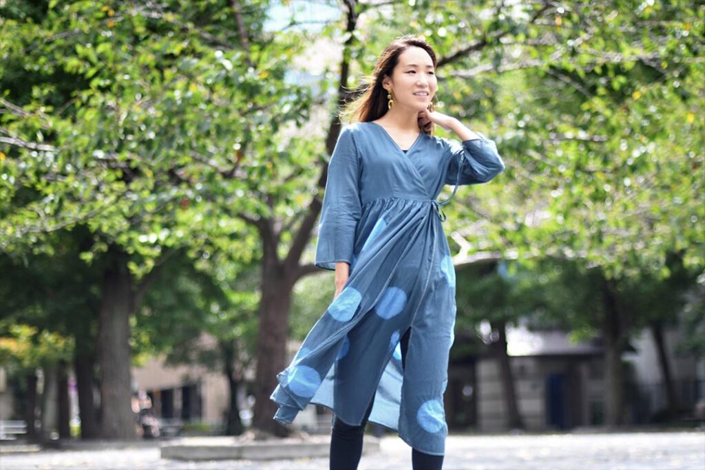 ブルーとグレーで2回染めて水玉模様の自分だけの藍色ワンピースができました。