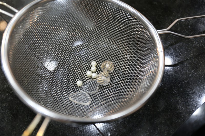 ②染め液の準備ができたら、染めたいビーズをザルなどに入れます。