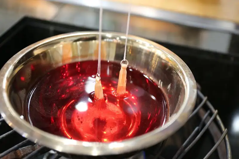 ③火にかけた染め液の中にビーズを入れ、菜箸で撹拌します。