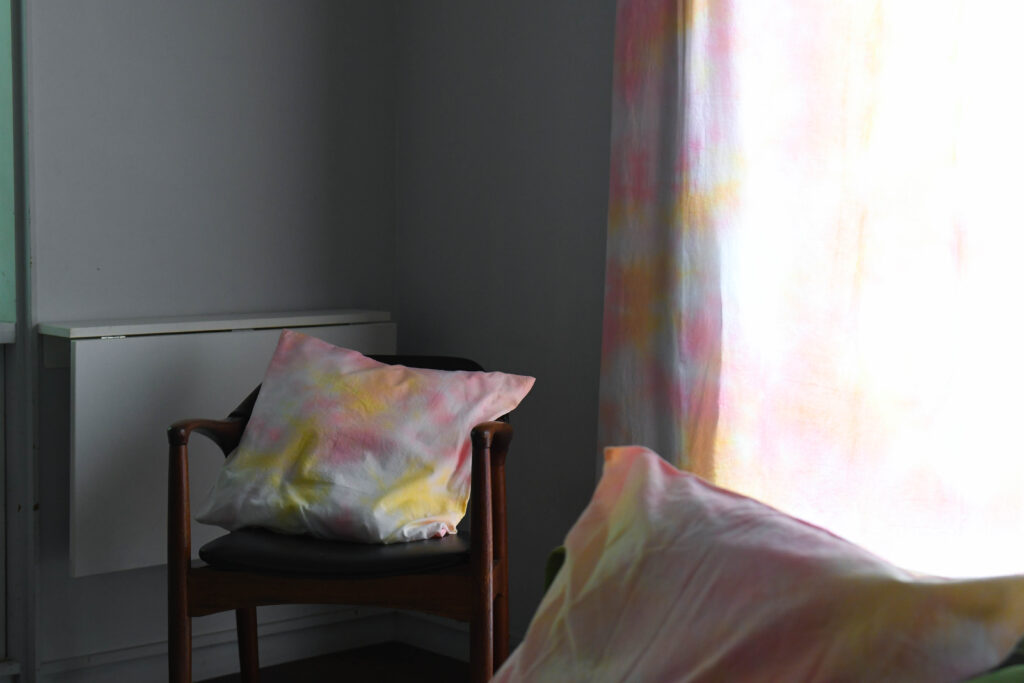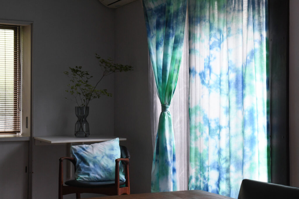 今回は白地のカーテンとクッションカバーも手染めすると、