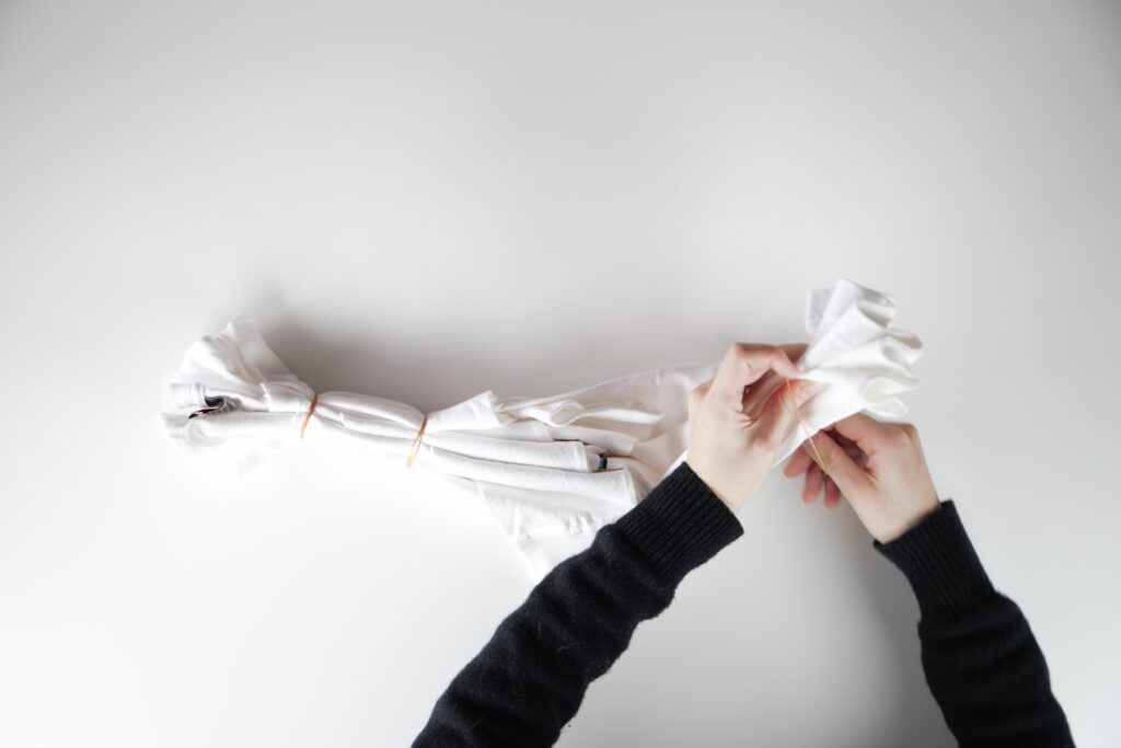 Tシャツを畳んで輪ゴムで絞り一度目の染色、その後輪ゴムを解いて、二度目の染色で