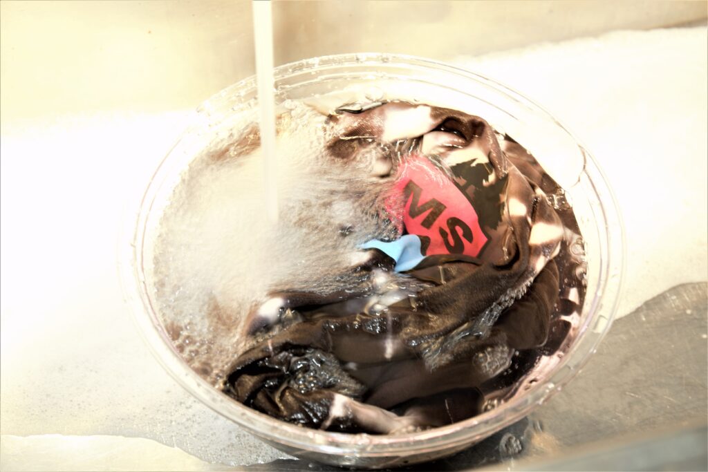 台所用液体中性洗剤を溶いたお湯(60℃)で、色が出なくなるまで(約5分)洗う