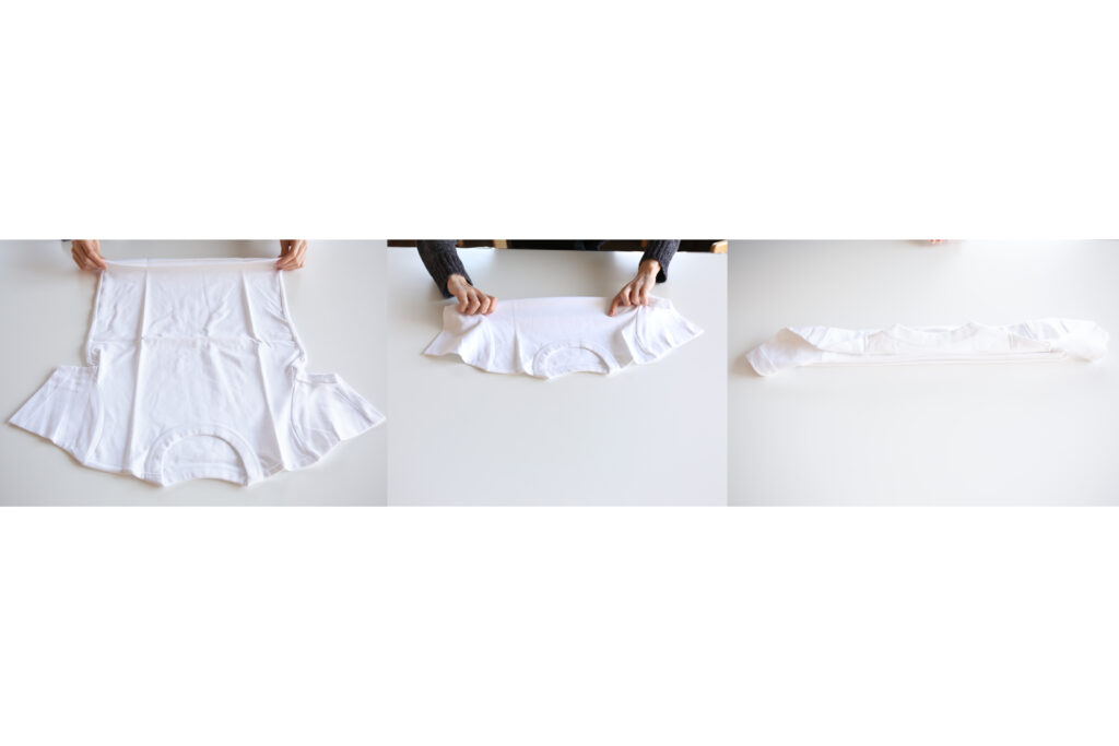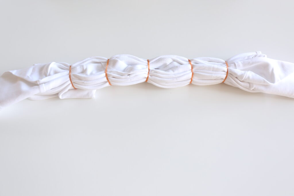 ①シャツを蛇腹に折ったら輪ゴムで絞ります。