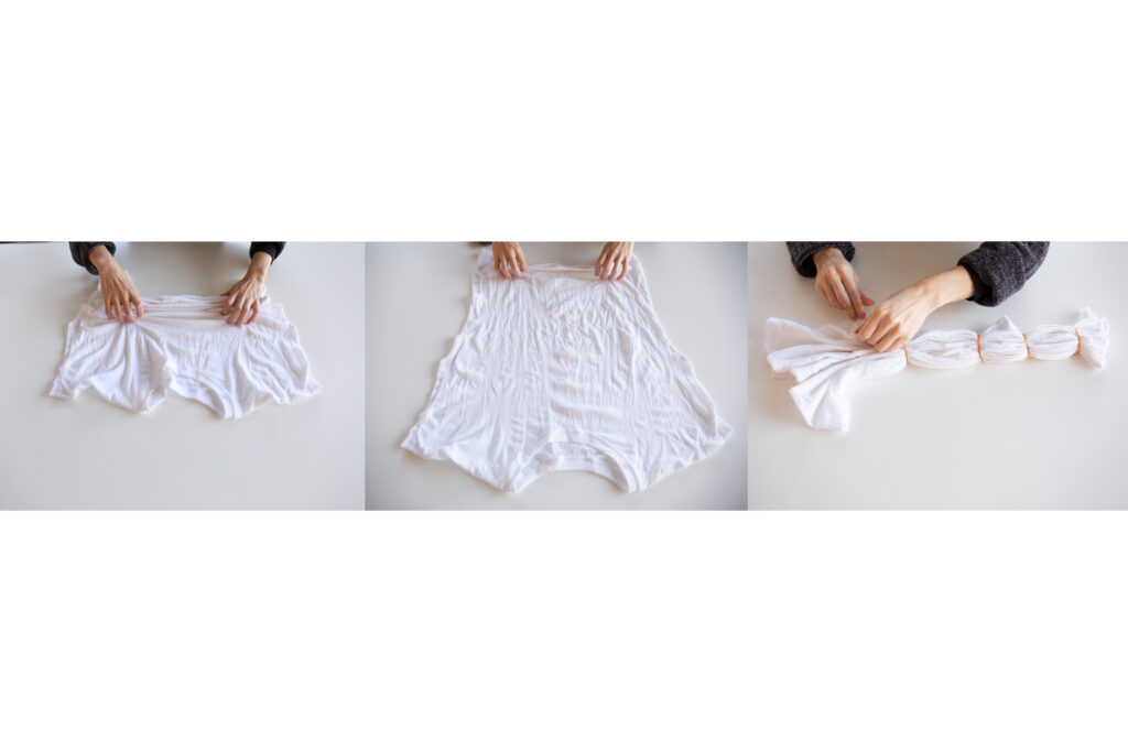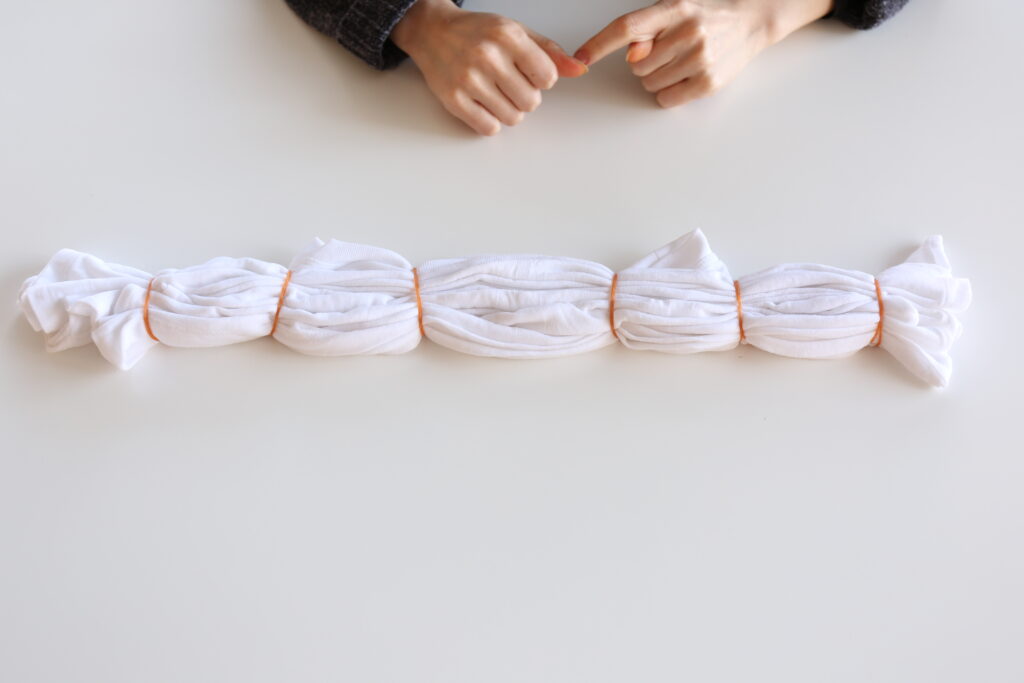 染めるTシャツを裾から襟に向かってジャバラ状に寄せながら絞ります。