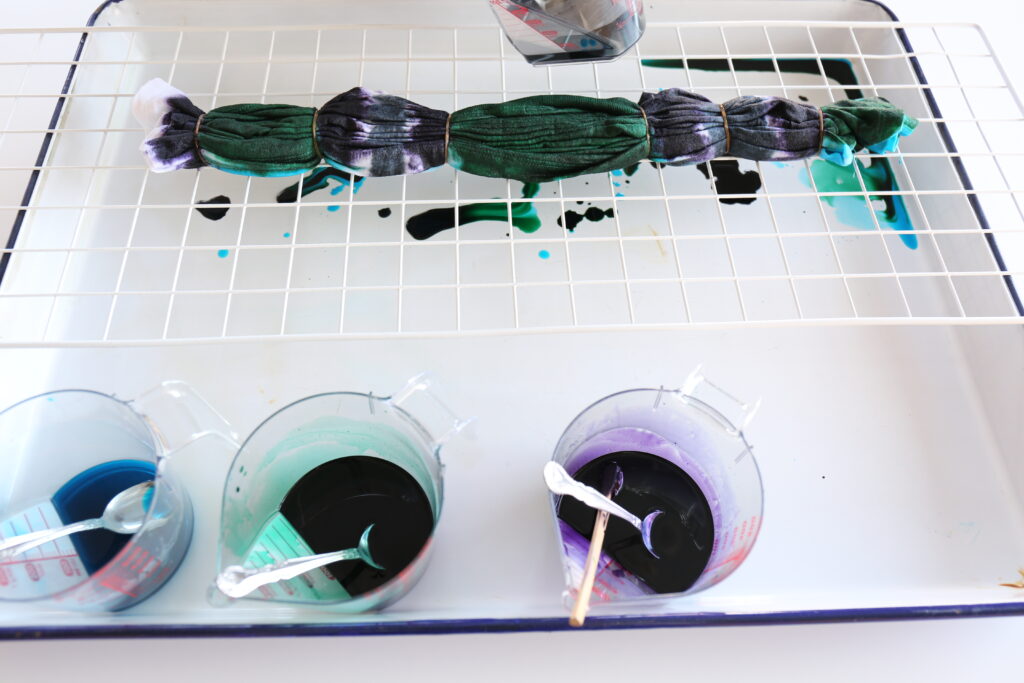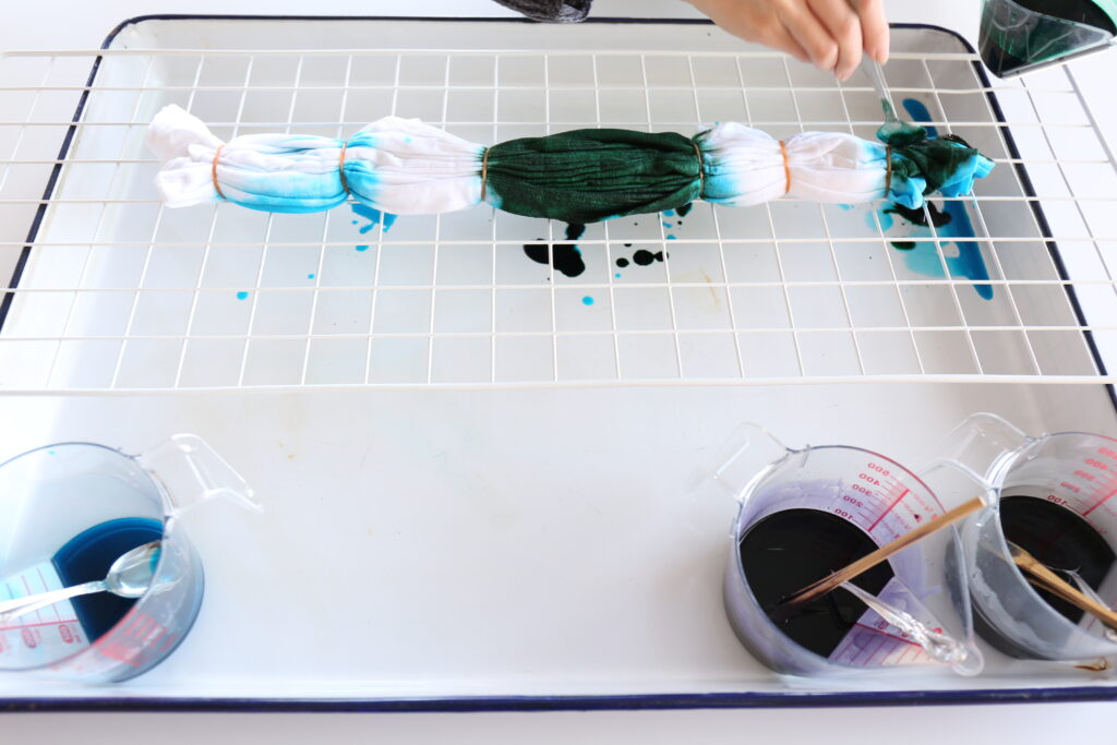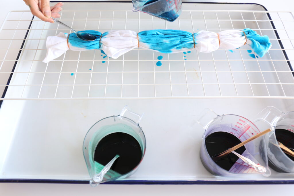 かけ方はお好みですが、ボーダーにする場合は輪ゴムで絞った部分を色の境目の目安にすると染めやすいです。