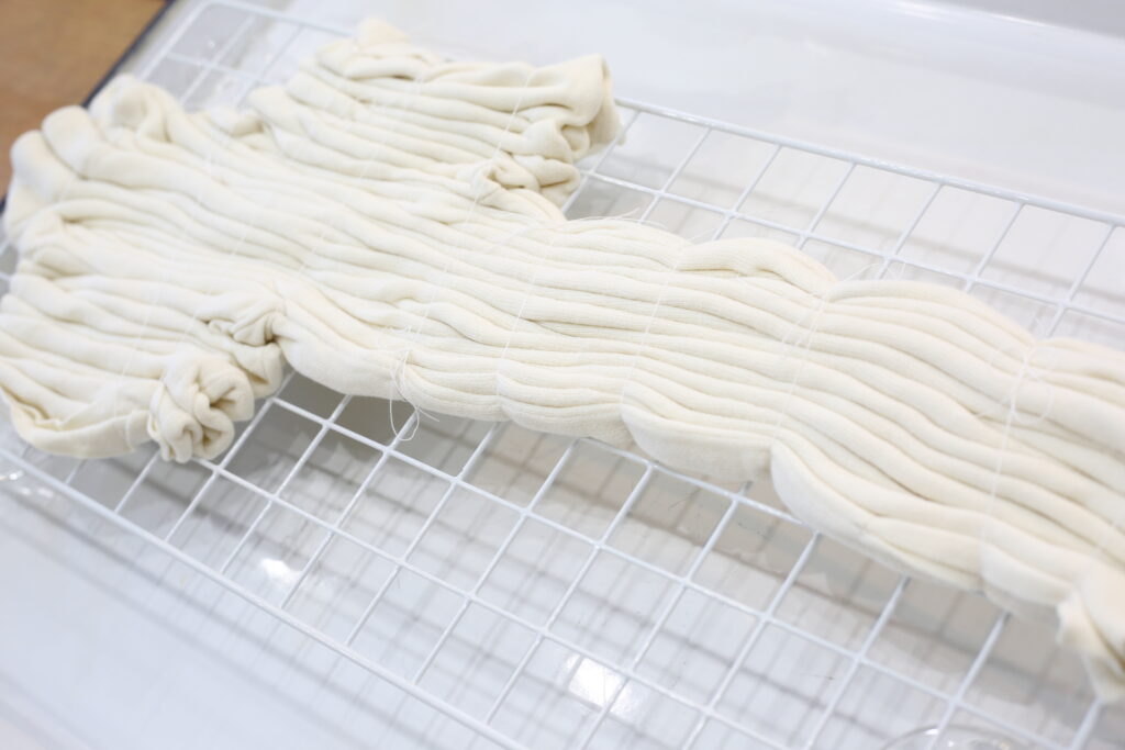 ⑦植物繊維のため別売りの色止め剤ミカノールで色止めの処理を行い、脱水をして陰干しをしたら完成です!