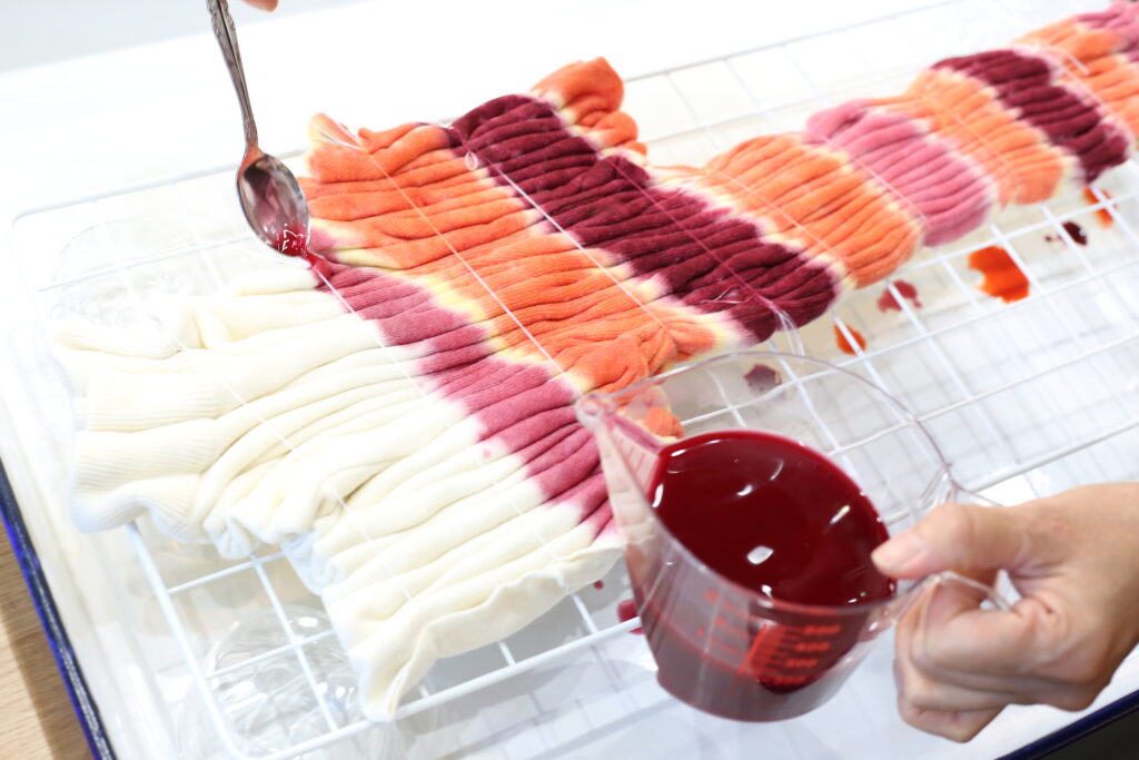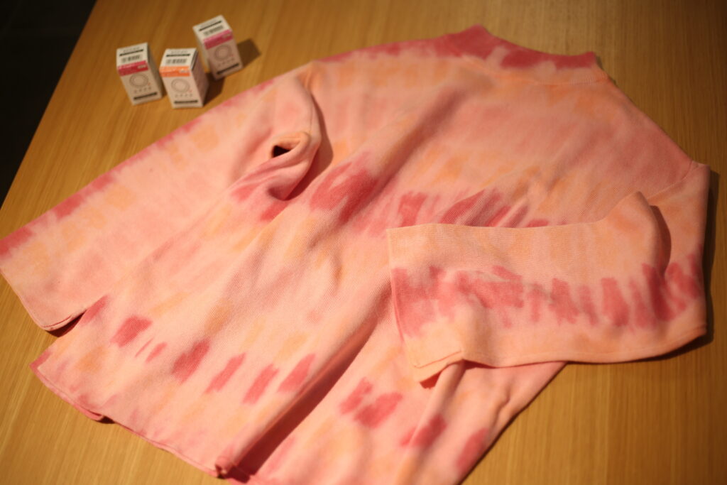 今回はやさしい色でご家庭でも染めやすい低温染めの染料「コールダイオール」を使って自由な染め柄を楽しんでみました。