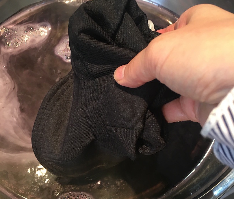 ④そこへ帽子を入れ、よく攪拌しながら30分染めます。