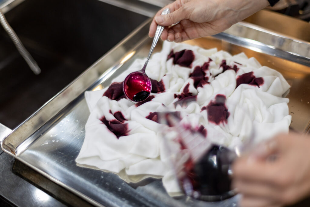 ⑧ 染め残った箇所やヒダの間などを中心に、⑥の染め液に希釈用お湯を入れて薄め、かけ染めをします。こうすることで濃い色と薄い色の部分が出来上がります。