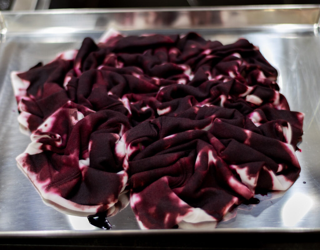 トレーナーの裏も同じように染め液をまだらにかけて染めます。