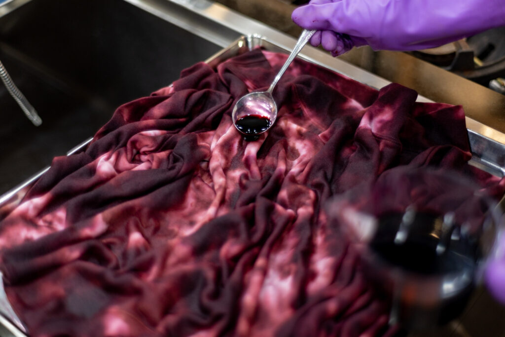 ⑦ ⑥で作った染め液をスプーンなどですくいながらトレーナーにまだらにかけて染めていきます。