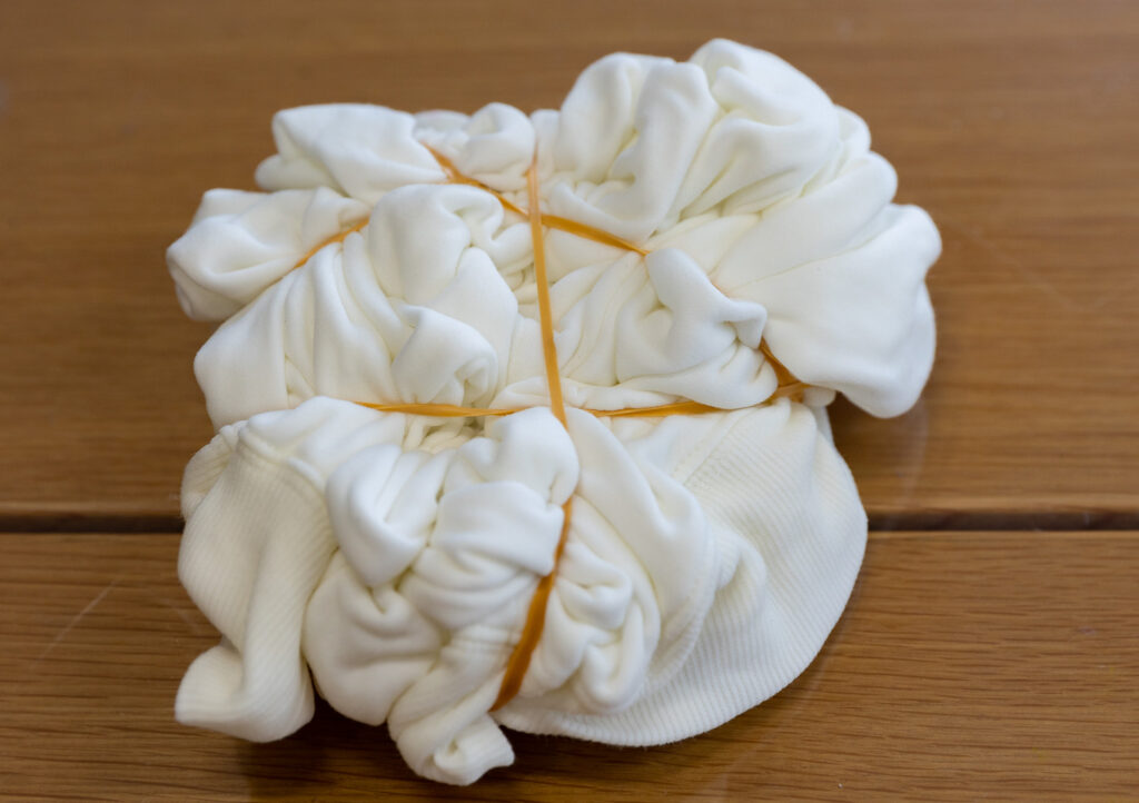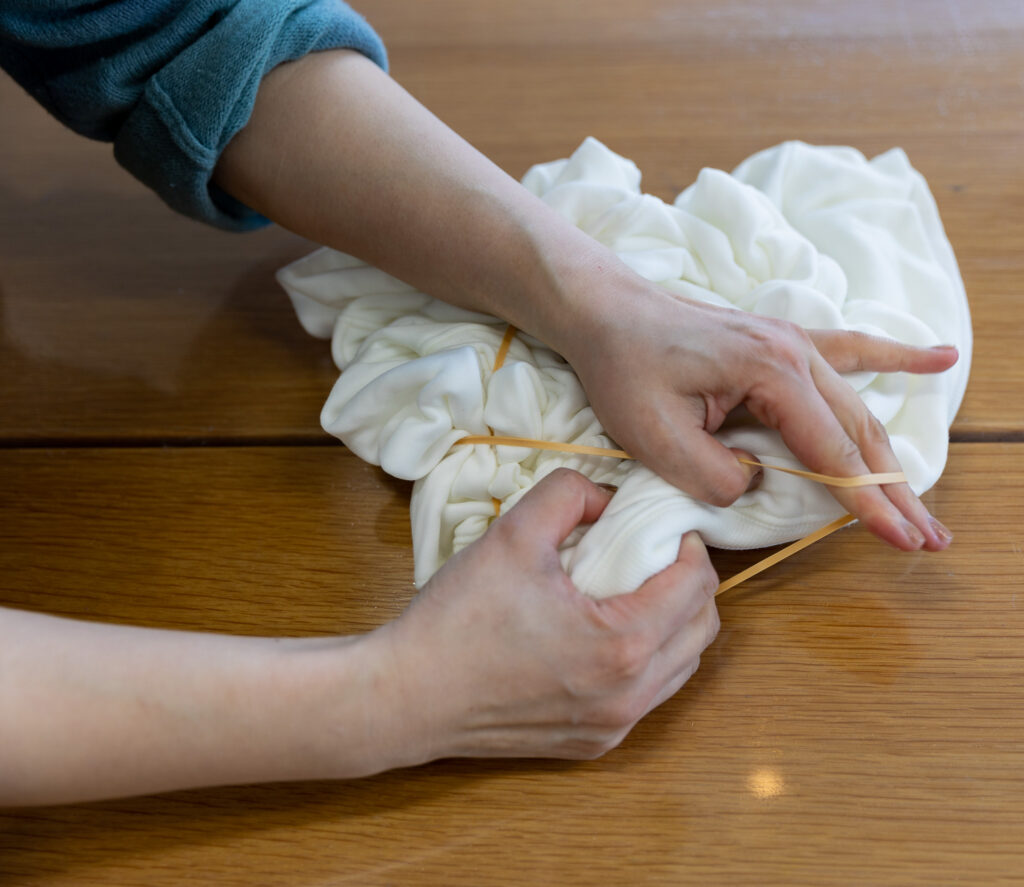 絞ったところにも染め液は染み込んでいきますが、きつく絞ることで、染め液が染み込むところと染み込まないところに差が生まれ、染め上がります。
