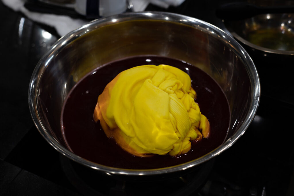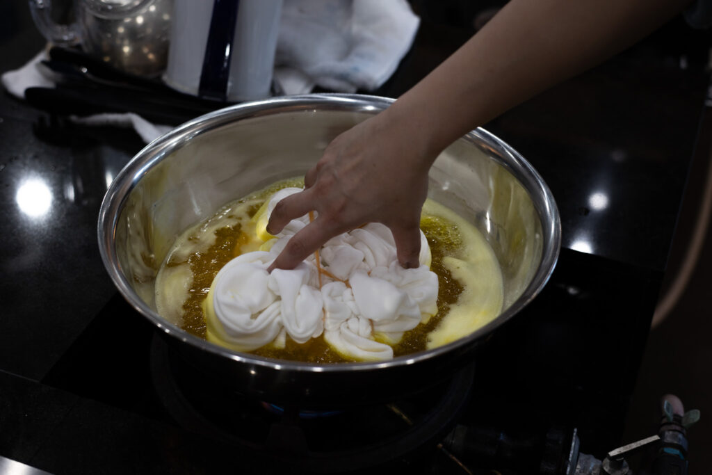 ③火にかけて90℃程度の温度の染め液に表裏を片面ずつ10分程度、浸して染めます。