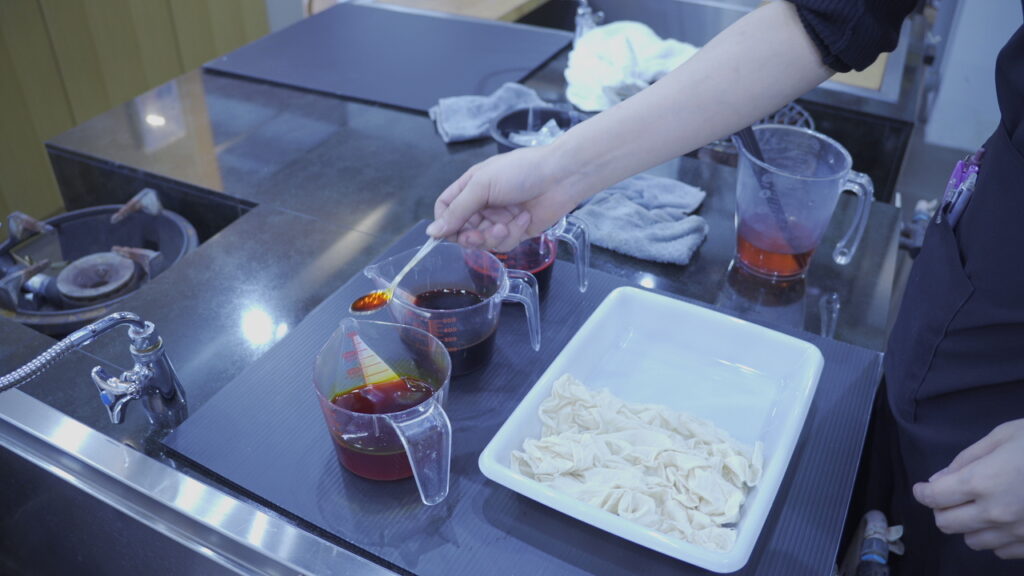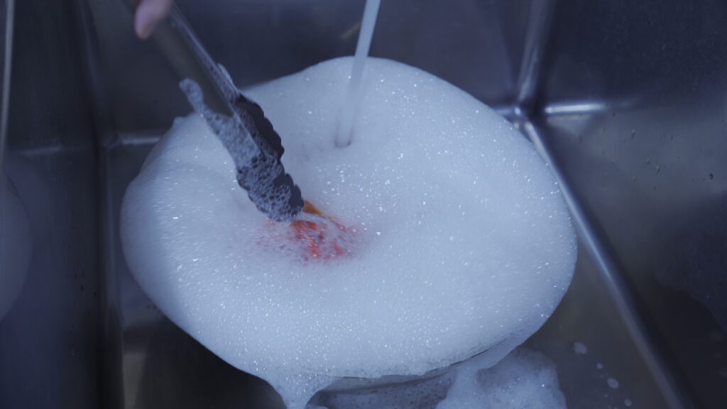 染め液から出して水で軽くすすいだ後、中性洗剤を溶いた60℃のお湯で余計な染料を落とします。