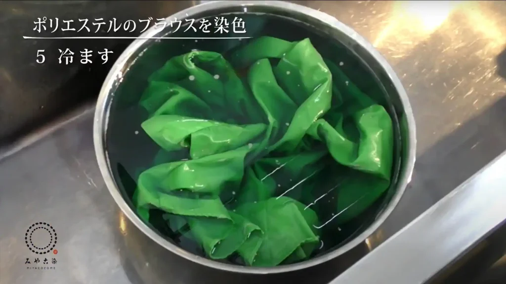 染め上がったら染め液から取り出し、染めていた温度よりもやや低いお湯の中に入れて、ゆっくりと冷まします。