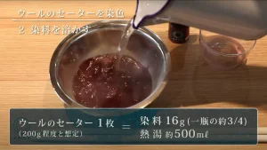 ウールの染め方の詳細は動画を見ていただいた方がわかりやすいと思いますので、ここではおおまかな流れをご紹介します。