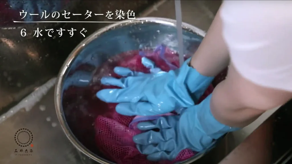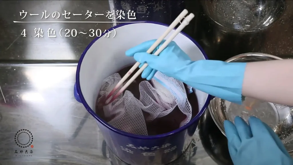 毛織物や毛糸は傷み安いので、静かにゆっくりかき混ぜながら染めてください。