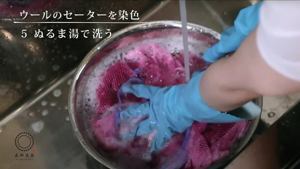 さらに、ぬるま湯に台所用液体中性洗剤を溶かし、染料の色が出なくなるまで洗います。