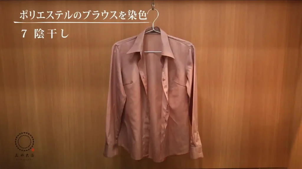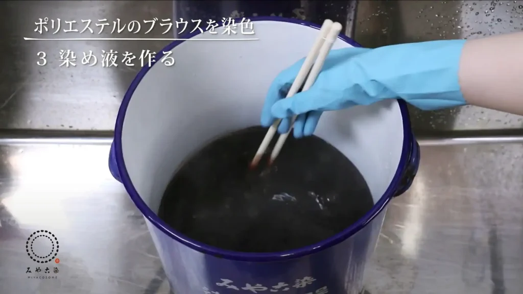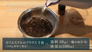 動画ではブラウス(約200g)に対して染料16gを熱湯500mlで溶かしています。