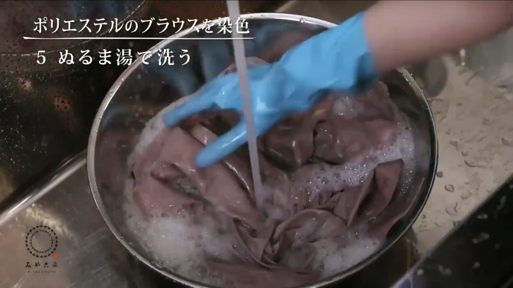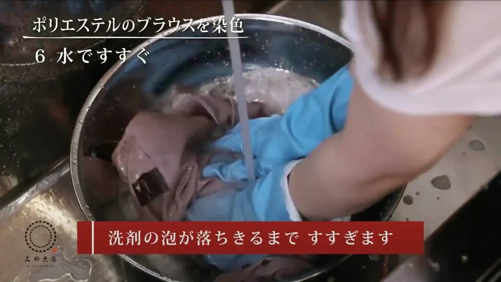 その後、ぬるま湯に台所用液体中性洗剤を加え、染料の色が出なくなるまで洗います。