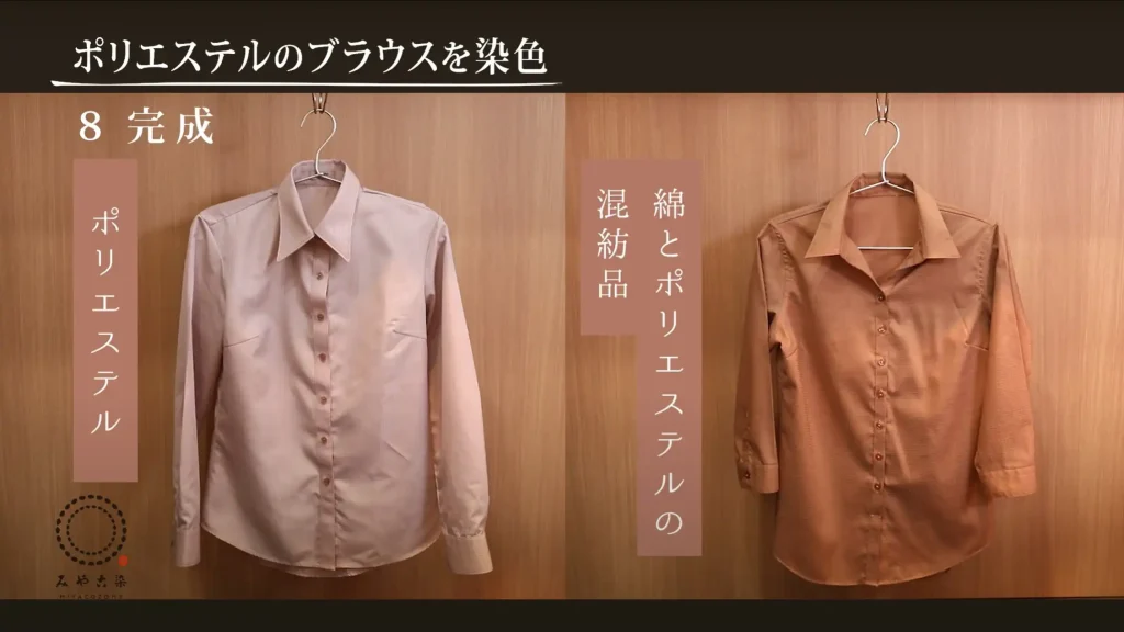 お洋服などで見ることの多いポリエステルと植物繊維や動物繊維の混紡品を染める方法をご紹介します。