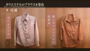 ポリエステルの混紡率や他の繊維の種類によって染め上がりの色に差が出ますので、染める前には素材をよく確認して染めてください。