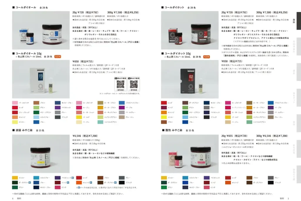 新しいカタログには定番商品の他、昨年新しく発売されましたコールダオール・ホット10g+色止剤ミカノール10mlやタイダイ染めなどのキットを追加し、商品ページをボリュームアップいたしました。