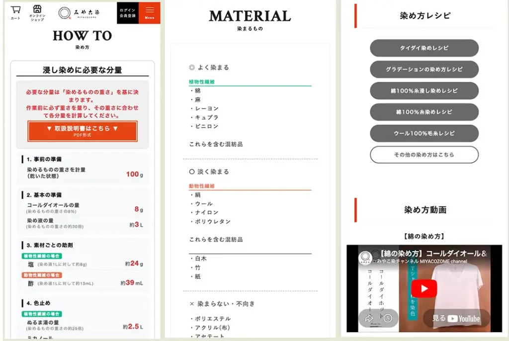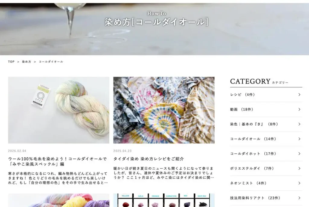 さらに詳しく染め方や技法を知りたい方のために『商品説明』と『染め方』のページも合わせてリニューアル。必要な染料や染め液の量の計算方法、使用する染料や染めたい素材、技法に合わせたより具体的な染色手順のご紹介など、さまざまなお役立ちコンテンツを揃えております。
