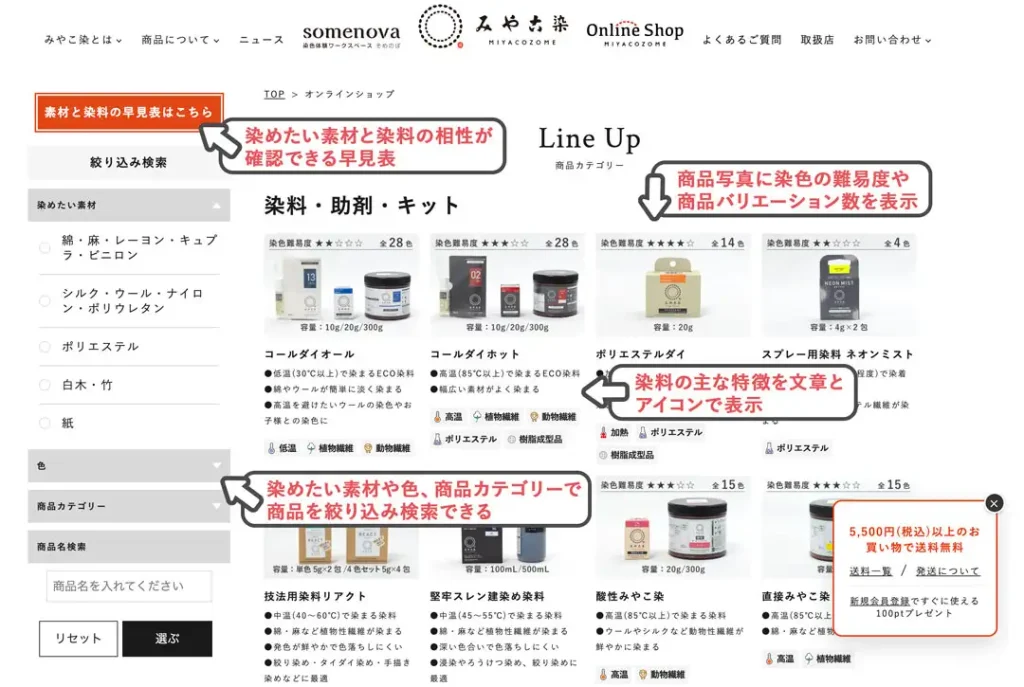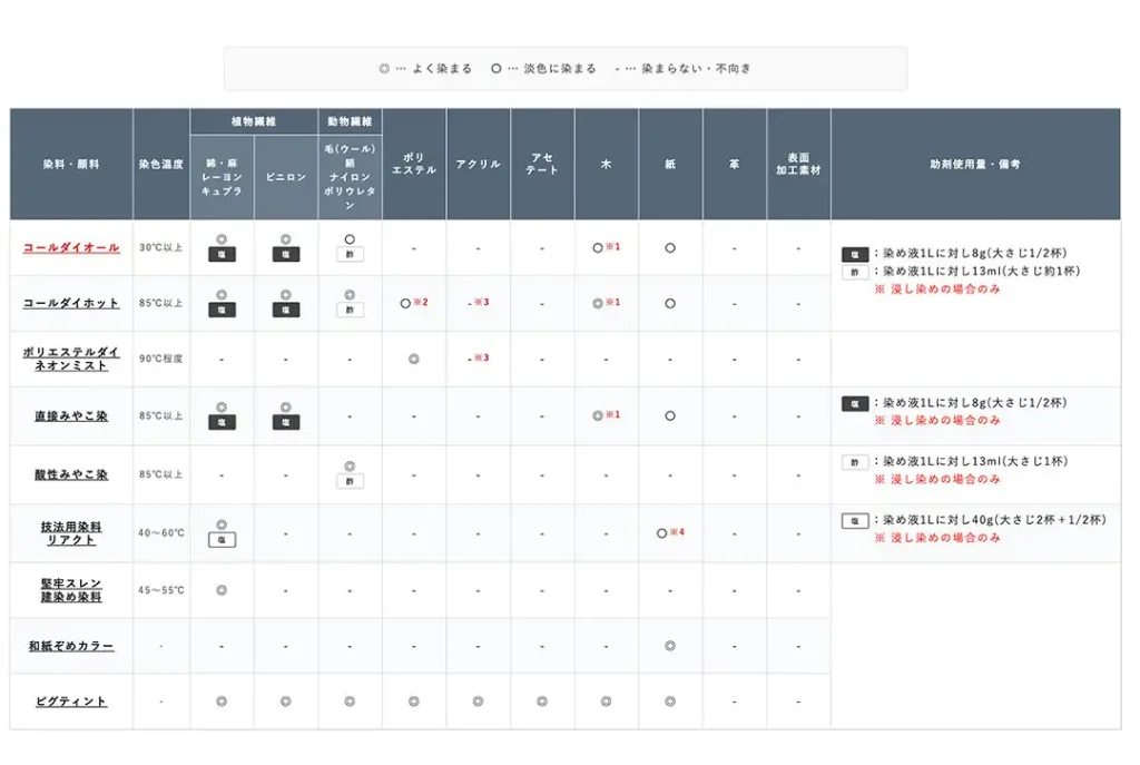 染料の特徴や染色の難易度、染めたい素材の種類との相性など、さまざまな情報を掲載し、お客様の染料選びをサポート!