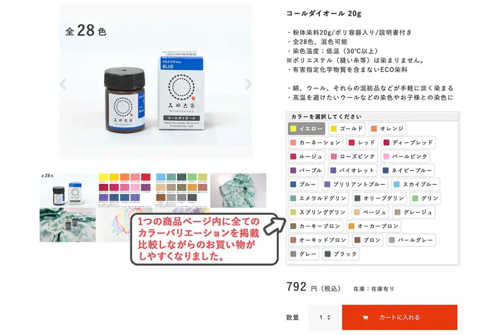 染料も色毎に掲載されていた商品が1ページにまとまり、色を見比べながらお買い物ができるようになります。