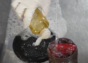 つまみ細工の小さな生地に相応しく、大きな容器は使わず、付属の染色ボトルで手軽に染めることが