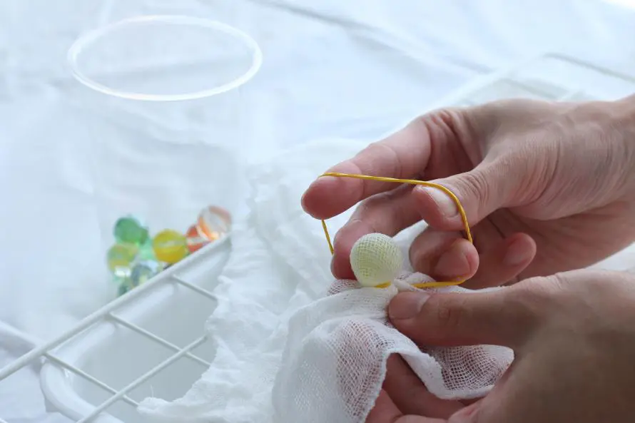 ビー玉と輪ゴムで白い花ふきんを絞り、染料をかけることで、