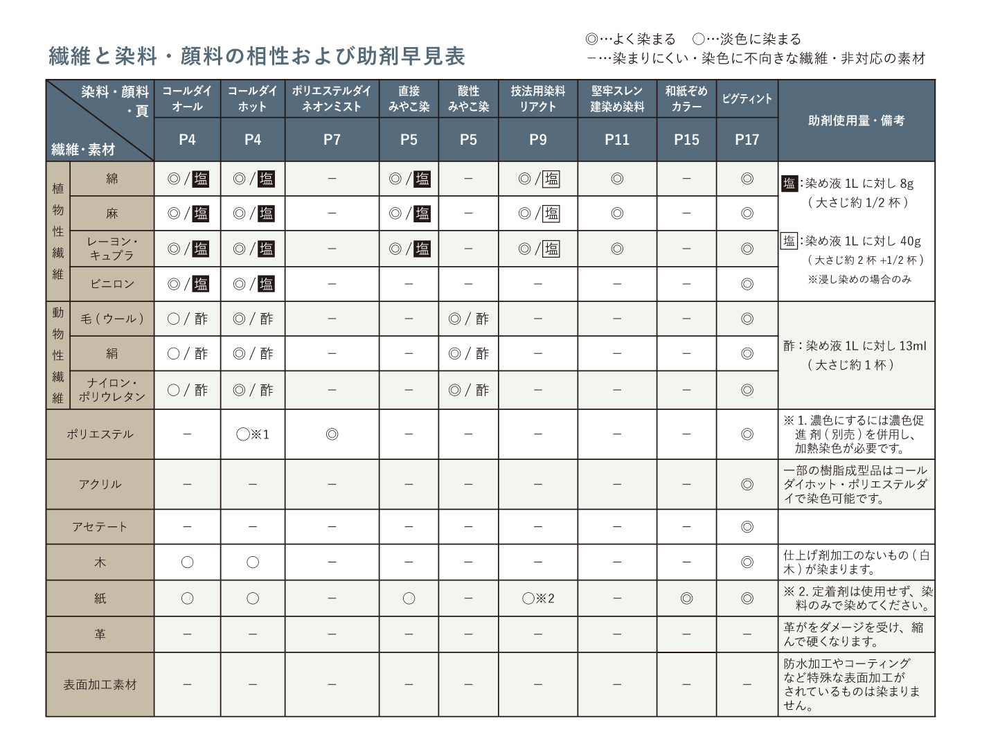 繊維と染料の相性及び助剤早見表をご参照ください。