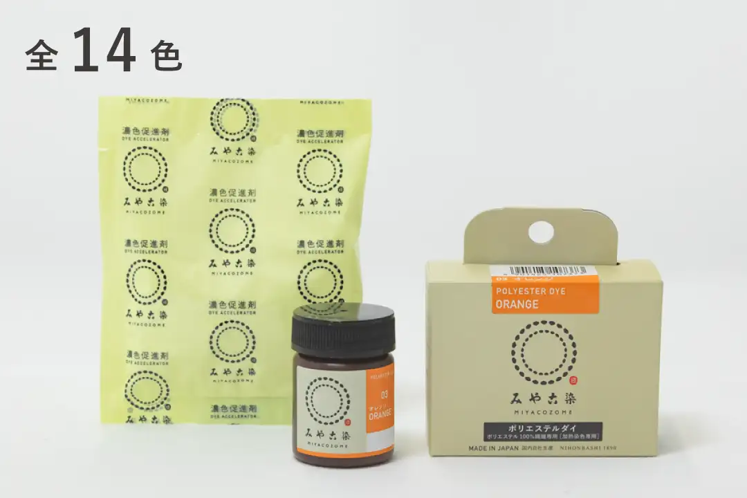 ポリエステルを濃く染めたい場合 濃色促進剤 (染め液1Lに対して約2g) ※濃色促進剤使用の場合は 加熱染色が必要です。 |