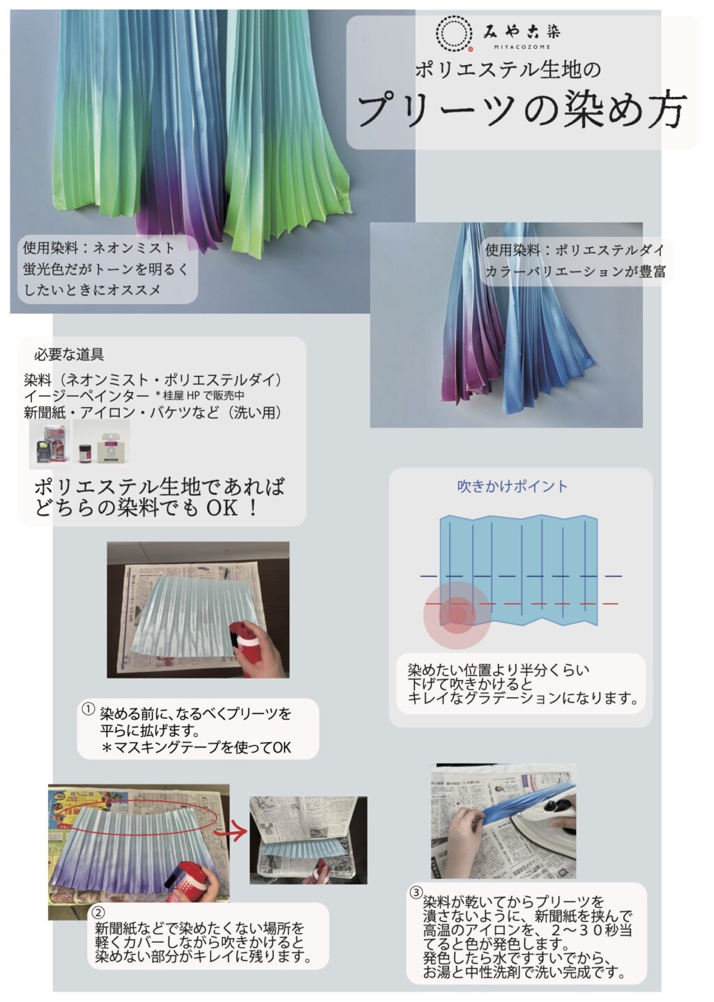 ガイアノーツ社の分離式スプレー「イージーペインター」の専用ボトルに、あらかじめ熱湯で溶かした「NEON MISTネオンミスト」染料を入れ、イージーペインターに取り付けて染料を噴射し、アイロンで固着することで発色します。人気の蛍光色(ネオンカラー)の染料スプレーの登場で、染色の幅が大きく広がります。