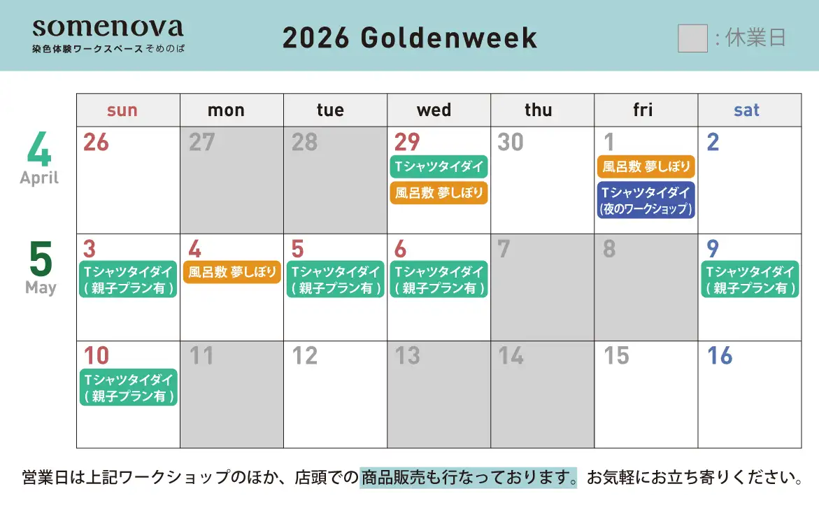 今年のゴールデンウィーク期間、4月29日(水)〜5月6日(水) somenovaは休まず営業いたします。 ☆5月1日(金) 平日夜のワークショップ☆お仕事帰りでも参加できる、18:00スタートのTシャツタイダイ染め体験です。お休み前のリフレッシュにいかがでしょうか? ★親子3名でのご予約がお得なプラン★親子でご参加されるお客様で、参加の合計人数が3名様(例:親1名子2名、親2名子1名など)の場合参加費がお得になる特別プランをご用意しております。プランが使用できる日程は下記の通りです。 Tシャツタイダイ染め:5月3日(日)、5日(火)、6日(水)、9日(土)、10日(日) 残りの募集人数が少なくなっているお日にちもございますので、ご予約はお早めに。 ワークショップのご予約はこちら https://www.katsuraya-fg.com/somenova_event/ ◆店頭での商品販売も通常通り行なっております◆ ゴールデンウィーク期間中もsomenovaの店頭では通常通り、みやこ染の商品を販売しております。期間中は公式オンラインショップの休業日もございますので、お急ぎの方はぜひ日本橋のsomenovaをご利用ください。 皆様のご来店をお待ちしております。 ゴールデンウィーク期間中のオンラインショップやお問い合わせフォームについて、詳しくはこちらの記事をご覧ください。 https://www.katsuraya-fg.com/news/260422gw/